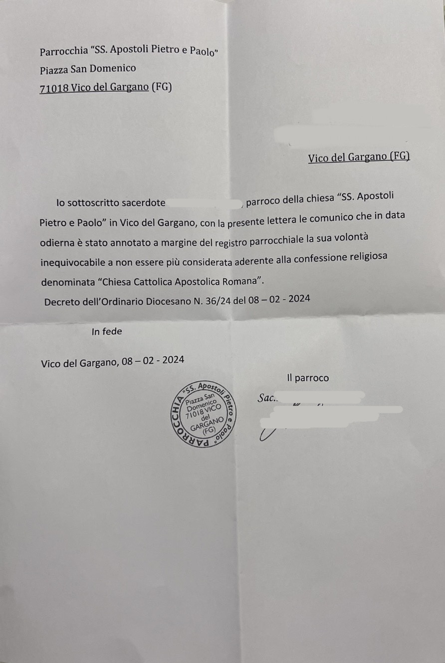 Una persona ha chiesto la rettifica dei dati relativi al proprio battesimo avvenuto a Ss. Apostoli Pietro e Paolo - VICO DEL GARGANO (FG) il 08/02/2024, dichiarando di non voler più far parte della Chiesa Cattolica.