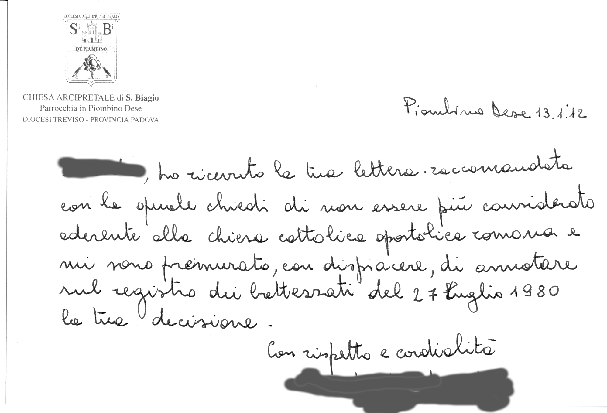 Una persona ha chiesto la rettifica dei dati relativi al proprio battesimo avvenuto a S. Biagio Vescovo e Martire - PIOMBINO DESE (PD) il 13/01/2012, dichiarando di non voler più far parte della Chiesa Cattolica.