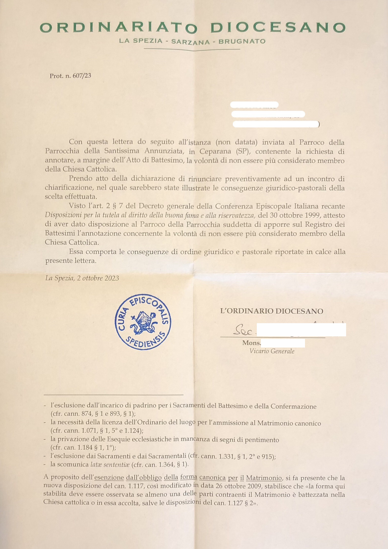 Una persona ha chiesto la rettifica dei dati relativi al proprio battesimo avvenuto a Santissima Annunziata - BOLANO (SP) il 04/10/2023, dichiarando di non voler più far parte della Chiesa Cattolica.