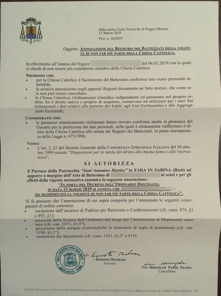 Una persona ha chiesto la rettifica dei dati relativi al proprio battesimo avvenuto a S. Antonino Martire - FARA IN SABINA (RI) il 13/03/2019, dichiarando di non voler più far parte della Chiesa Cattolica.