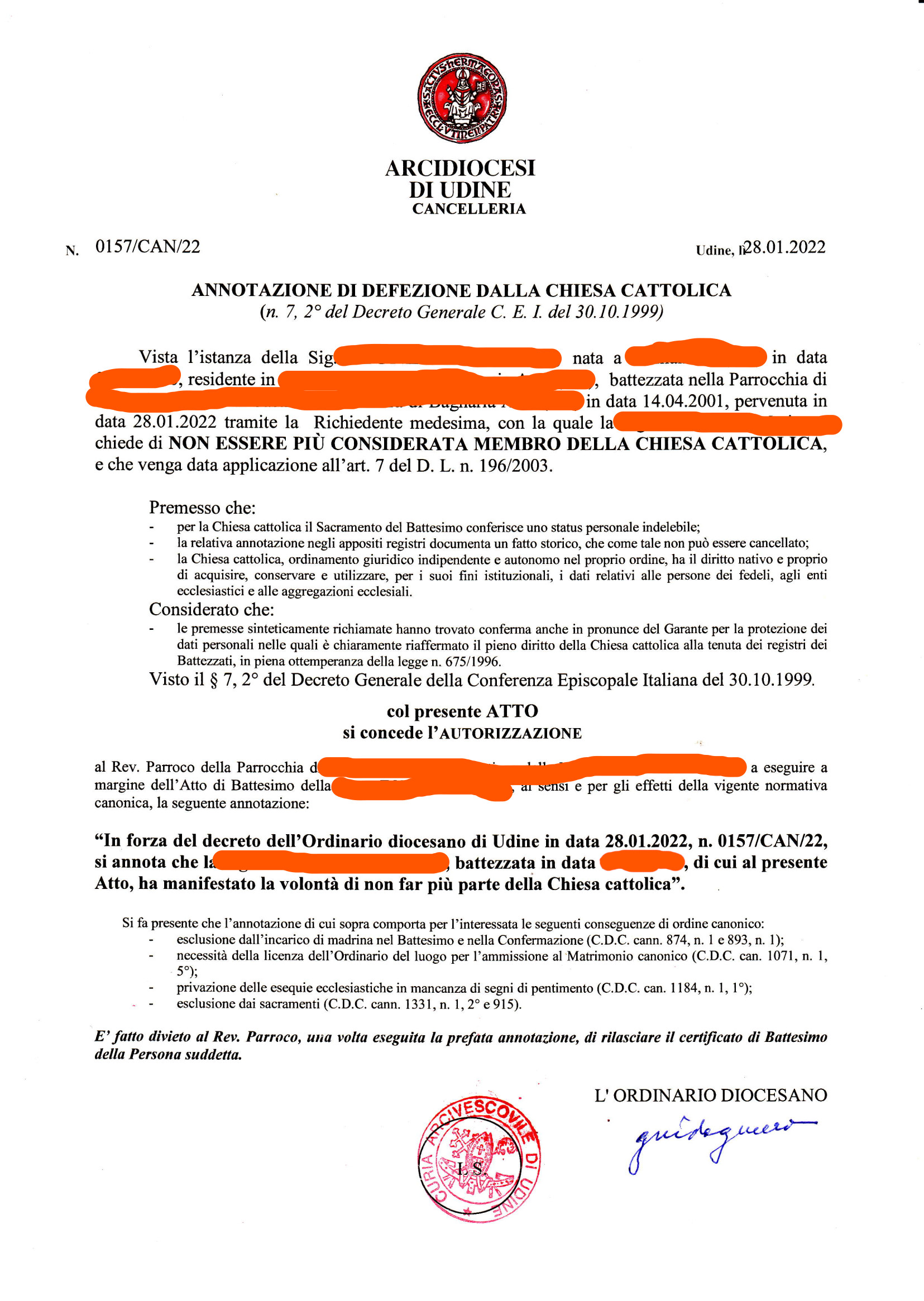 Una persona ha chiesto la rettifica dei dati relativi al proprio battesimo avvenuto a S. Maria Assunta - TORVISCOSA (UD) il 02/02/2022, dichiarando di non voler più far parte della Chiesa Cattolica.