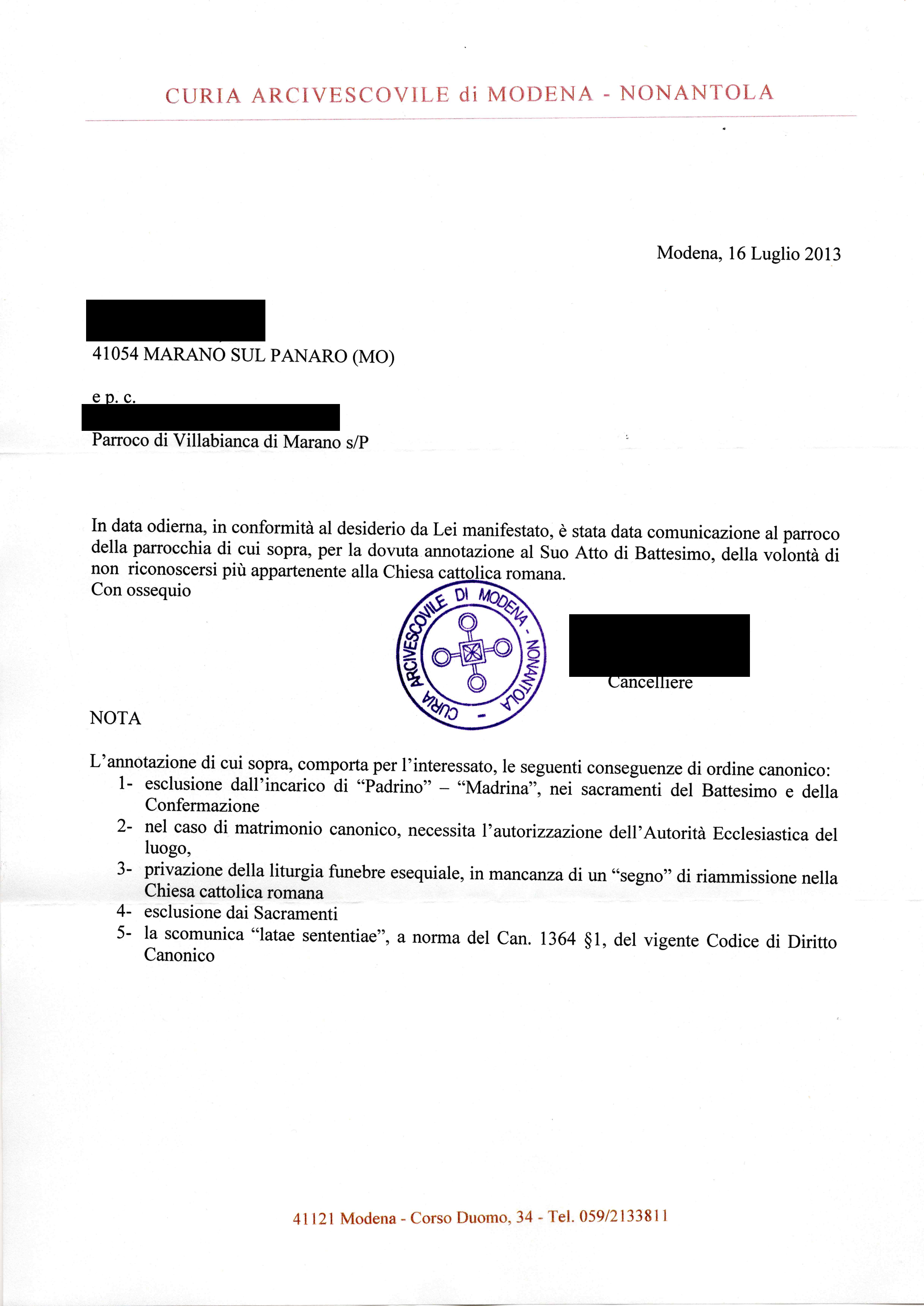 Una persona ha chiesto la rettifica dei dati relativi al proprio battesimo avvenuto a San Geminiano Vescovo - MARANO SUL PANARO (MO) (MO) il 16/07/2013, dichiarando di non voler più far parte della Chiesa Cattolica.