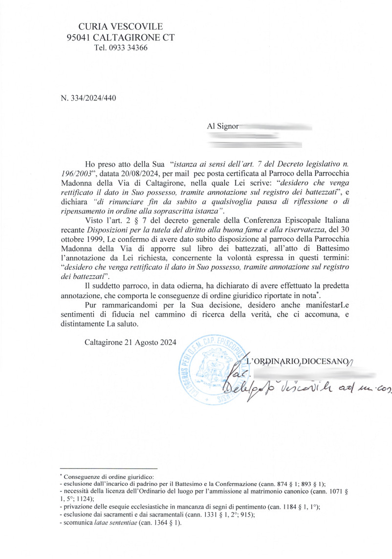 Una persona ha chiesto la rettifica dei dati relativi al proprio battesimo avvenuto a Madonna della Via - CALTAGIRONE (CT) il 21/08/2024, dichiarando di non voler più far parte della Chiesa Cattolica.