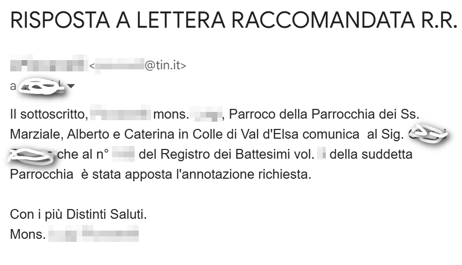 Una persona ha chiesto la rettifica dei dati relativi al proprio battesimo avvenuto a S. Caterina V. e M. - COLLE DI VAL D'ELSA (SI) il 27/12/2000, dichiarando di non voler più far parte della Chiesa Cattolica.