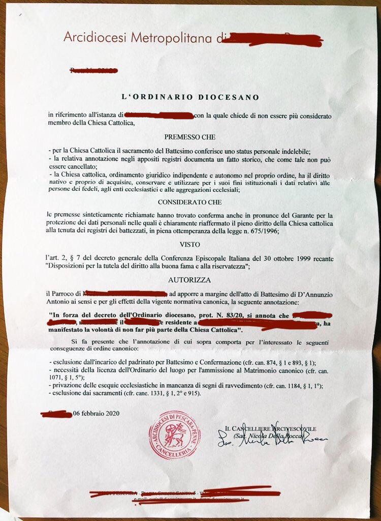 Una persona ha chiesto la rettifica dei dati relativi al proprio battesimo avvenuto a Madonna dei Sette Dolori - PESCARA (PE) il 06/02/2020, dichiarando di non voler più far parte della Chiesa Cattolica.