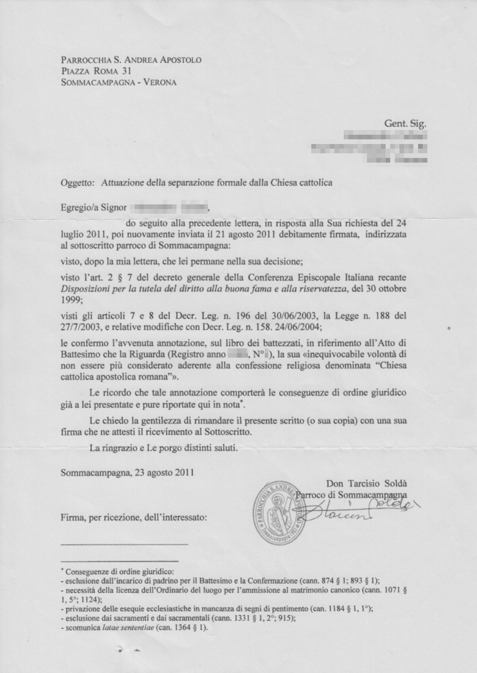Una persona ha chiesto la rettifica dei dati relativi al proprio battesimo avvenuto a S. Andrea Apostolo - SOMMACAMPAGNA (VR) il 23/08/2011, dichiarando di non voler più far parte della Chiesa Cattolica.