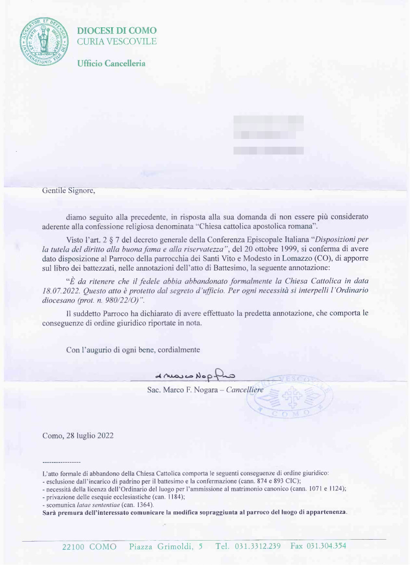 Una persona ha chiesto la rettifica dei dati relativi al proprio battesimo avvenuto a Santi Vito e Modesto - LOMAZZO (CO) il 02/08/2022, dichiarando di non voler più far parte della Chiesa Cattolica.