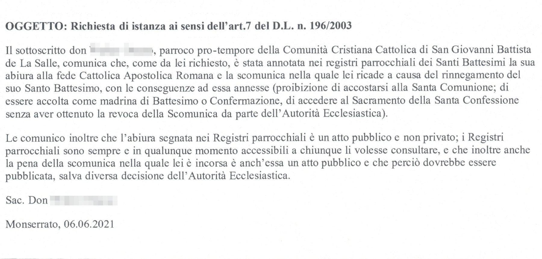 Una persona ha chiesto la rettifica dei dati relativi al proprio battesimo avvenuto a S. Giovanni Battista De La Salle - MONSERRATO (CA) il 06/06/2021, dichiarando di non voler più far parte della Chiesa Cattolica.