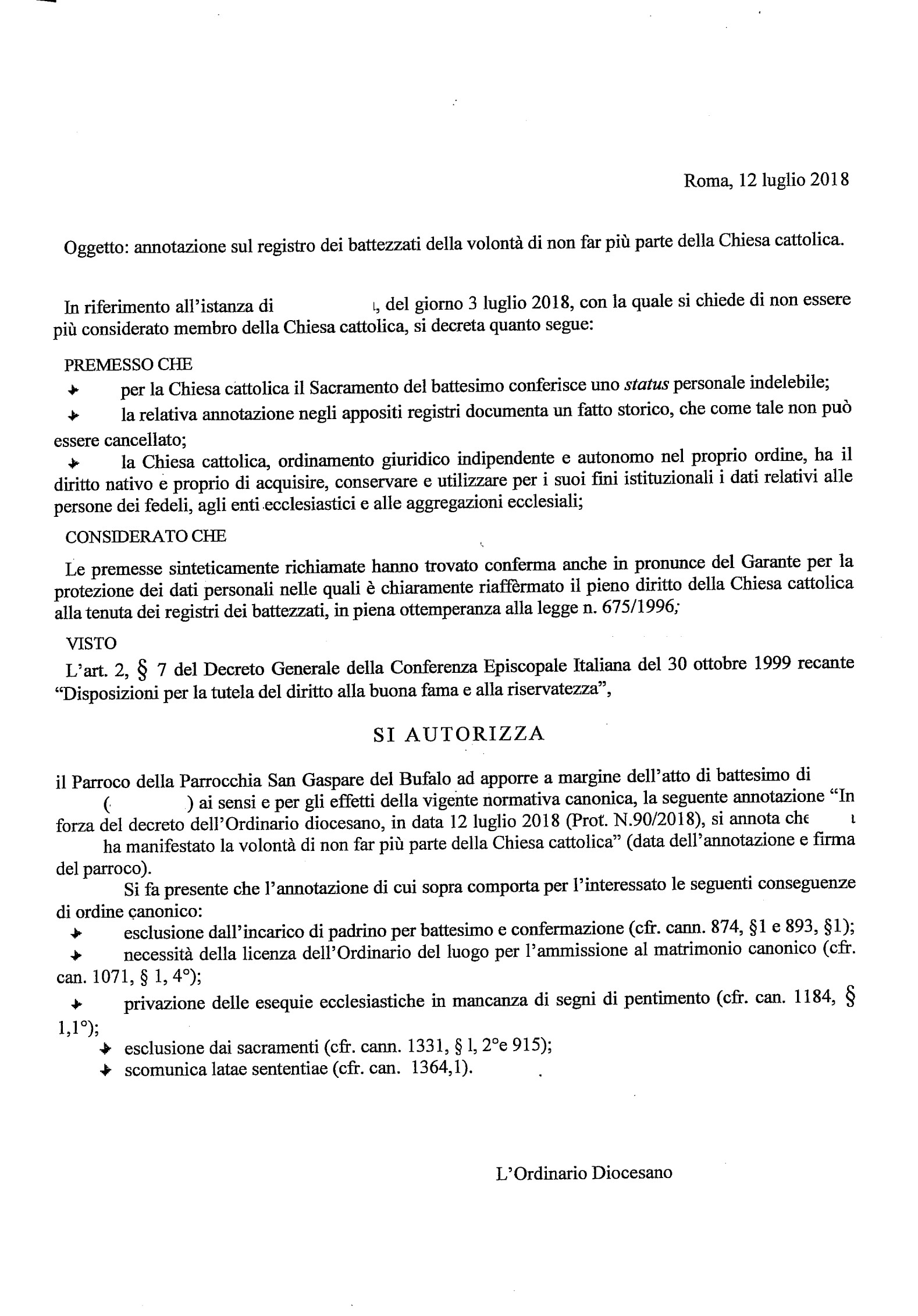 Una persona ha chiesto la rettifica dei dati relativi al proprio battesimo avvenuto a S. Gaspare del Bufalo - ROMA (RM) il 17/07/2018, dichiarando di non voler più far parte della Chiesa Cattolica.