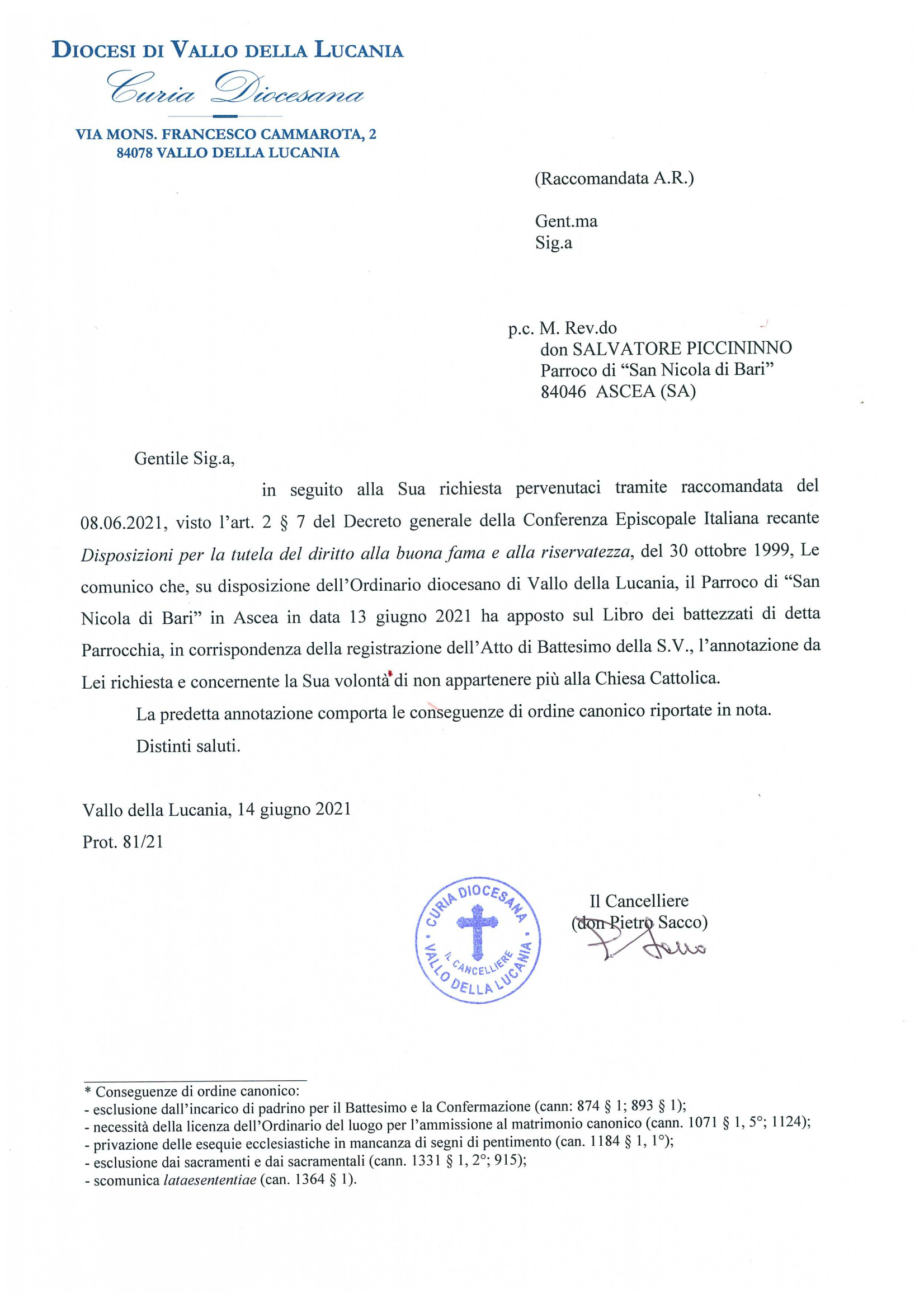 Una persona ha chiesto la rettifica dei dati relativi al proprio battesimo avvenuto a S. Nicola di Bari - ASCEA (SA) il 13/06/2021, dichiarando di non voler più far parte della Chiesa Cattolica.