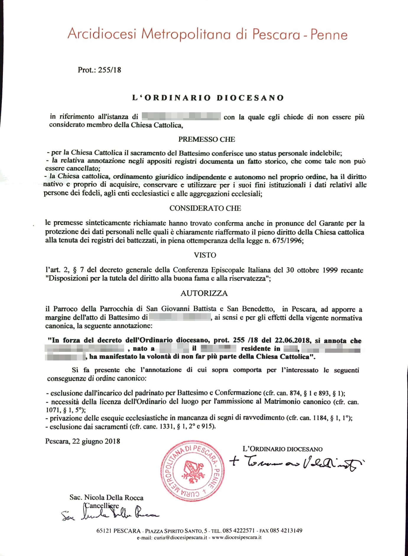 Una persona ha chiesto la rettifica dei dati relativi al proprio battesimo avvenuto a S. Giovanni Battista e S. Benedetto Abate - PESCARA (PE) il 02/11/2018, dichiarando di non voler più far parte della Chiesa Cattolica.