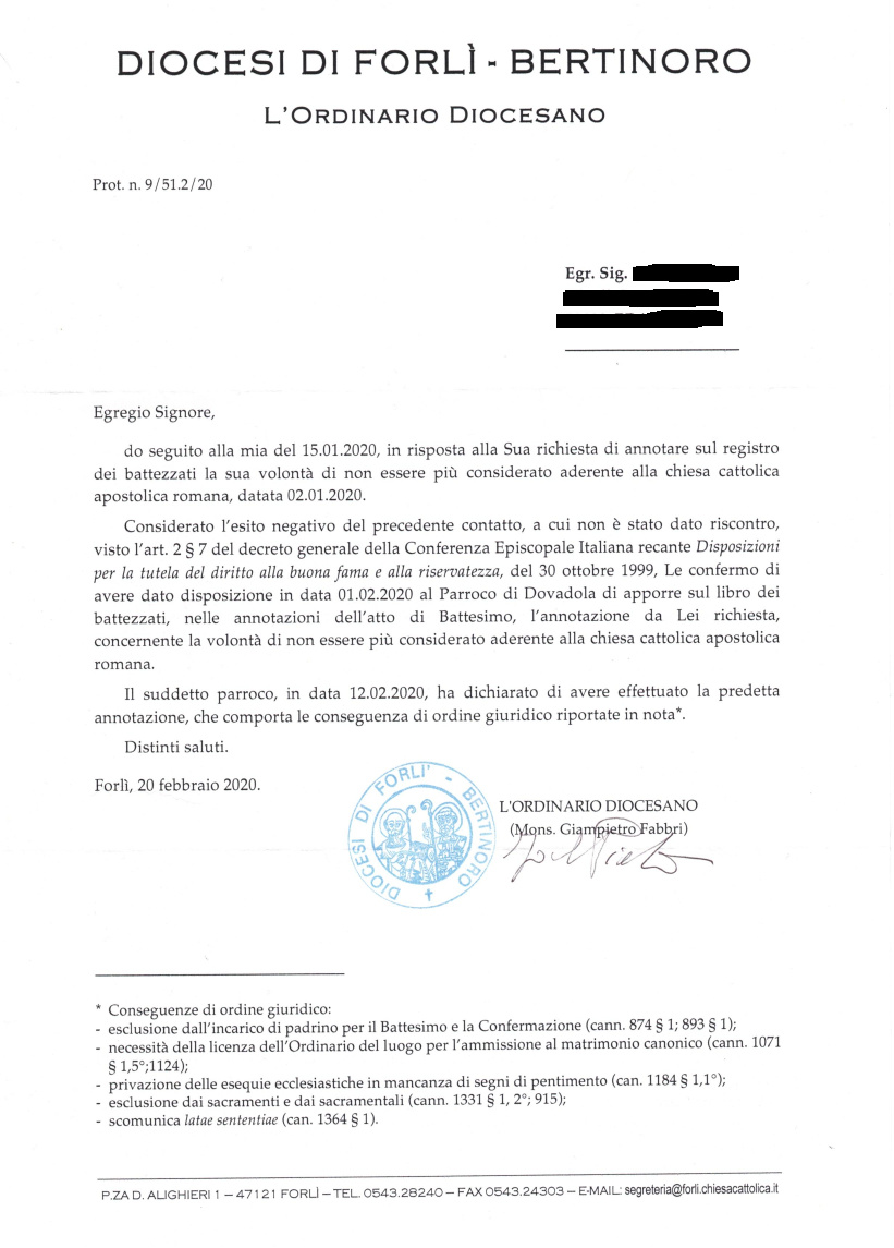 Una persona ha chiesto la rettifica dei dati relativi al proprio battesimo avvenuto a S. Andrea in Badia - DOVADOLA (FC) il 01/02/2020, dichiarando di non voler più far parte della Chiesa Cattolica.