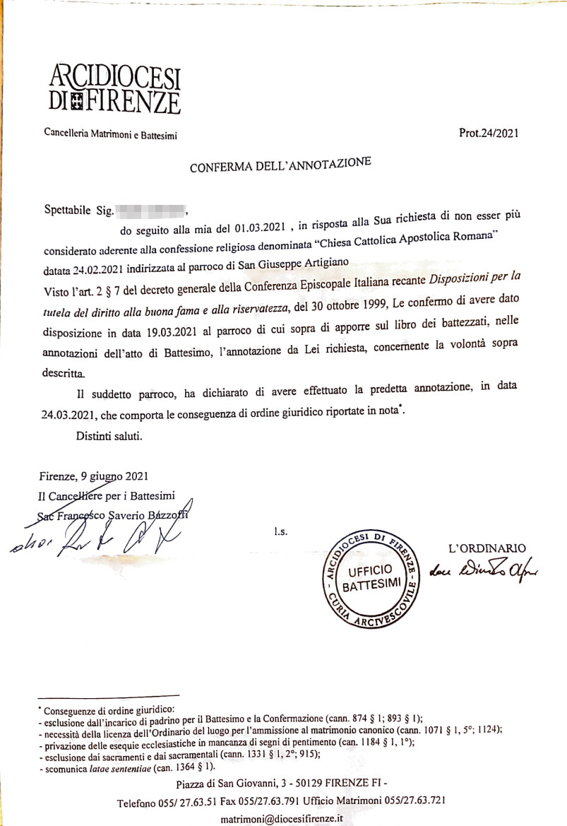 Una persona ha chiesto la rettifica dei dati relativi al proprio battesimo avvenuto a S. Giuseppe Artigiano - SESTO FIORENTINO (FI) il 09/06/2021, dichiarando di non voler più far parte della Chiesa Cattolica.