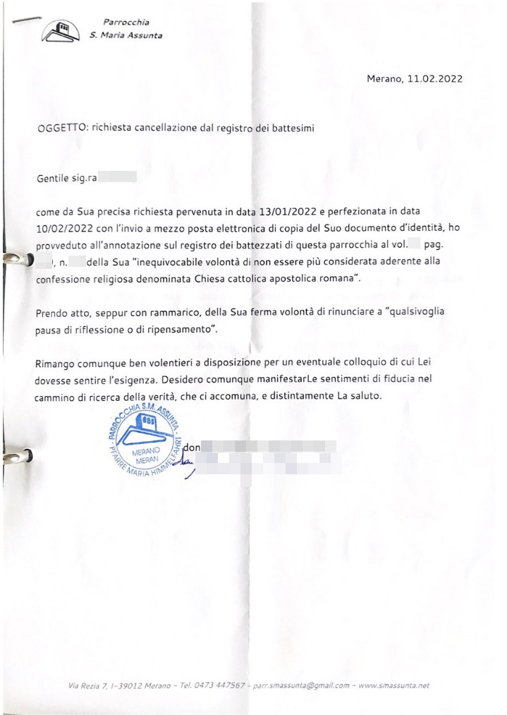 Una persona ha chiesto la rettifica dei dati relativi al proprio battesimo avvenuto a S. Maria Assunta - MERANO (BZ) il 11/02/2022, dichiarando di non voler più far parte della Chiesa Cattolica.