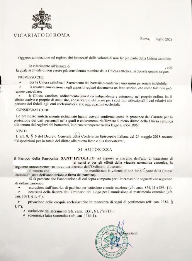 Una persona ha chiesto la rettifica dei dati relativi al proprio battesimo avvenuto a S. Ippolito - ROMA (RM) il 09/07/2021, dichiarando di non voler più far parte della Chiesa Cattolica.