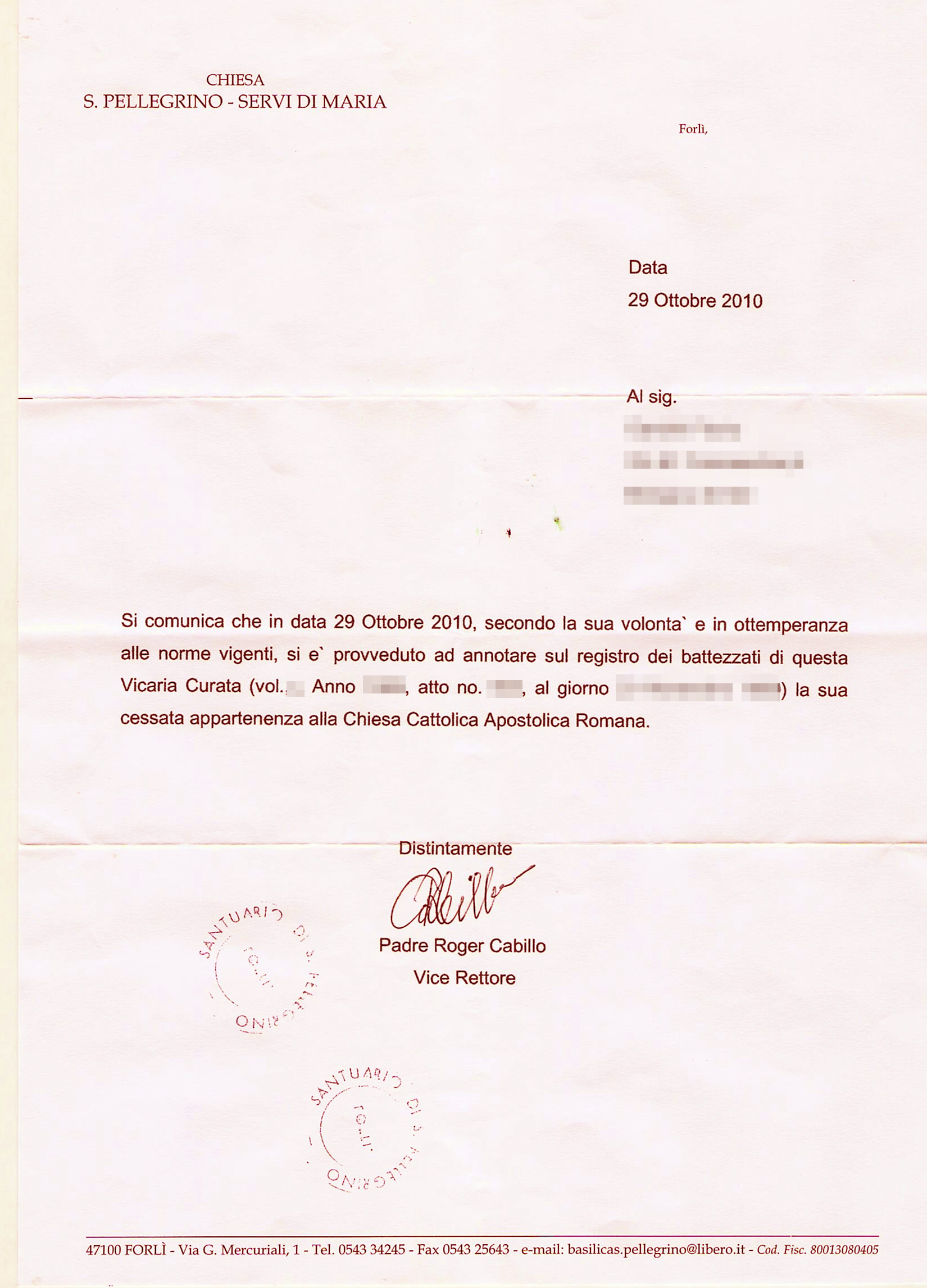 Una persona ha chiesto la rettifica dei dati relativi al proprio battesimo avvenuto a Basilica di Santa Maria dei Servi (San Pellegrino) - FORLÌ (FC) il 29/10/2010, dichiarando di non voler più far parte della Chiesa Cattolica.