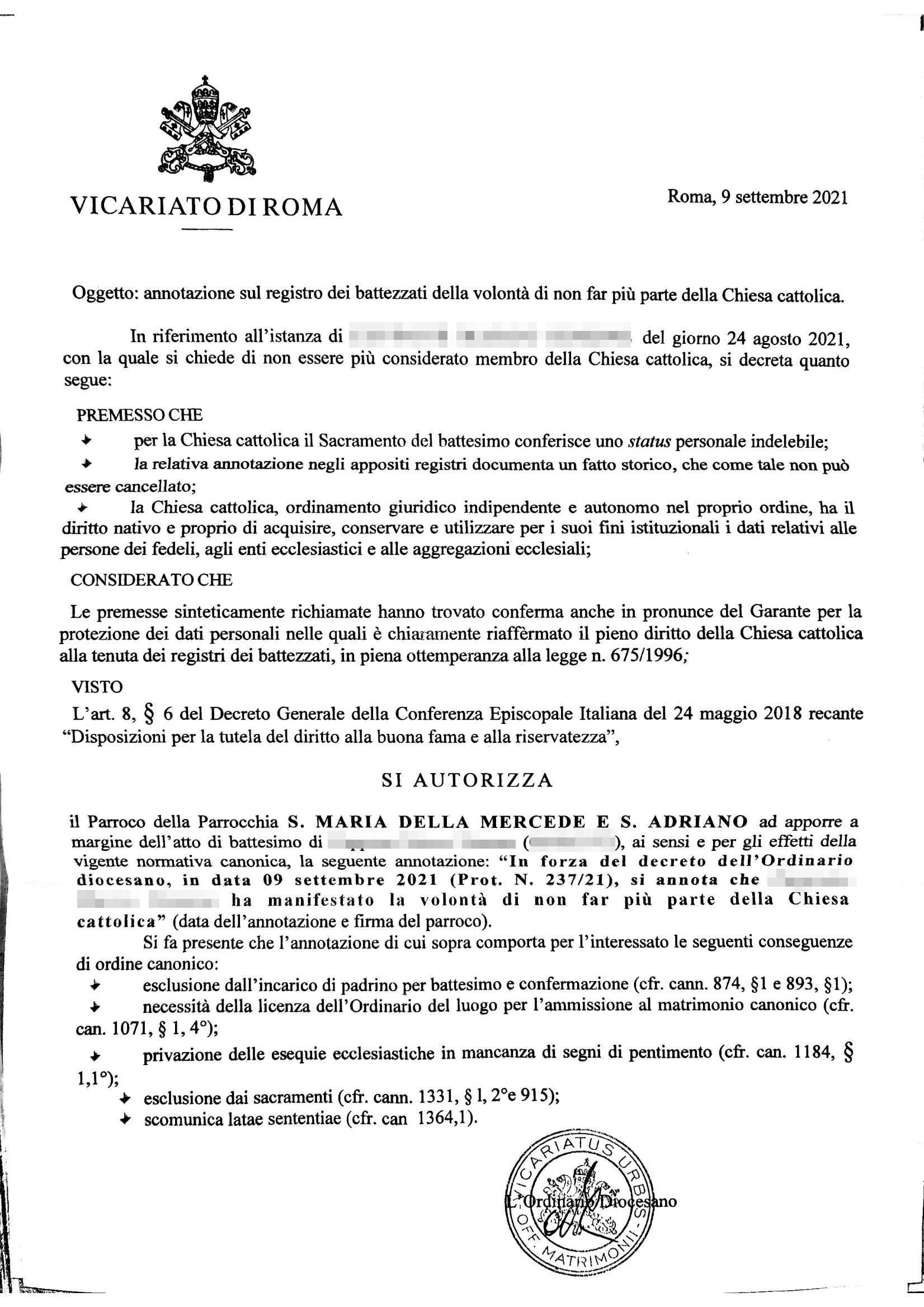 Una persona ha chiesto la rettifica dei dati relativi al proprio battesimo avvenuto a S. Maria della Mercede e S. Adriano - ROMA (RM) il 16/09/2021, dichiarando di non voler più far parte della Chiesa Cattolica.