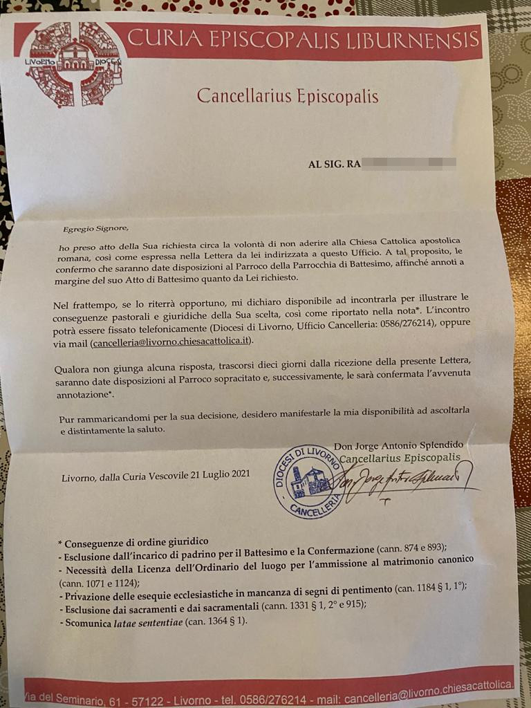 Una persona ha chiesto la rettifica dei dati relativi al proprio battesimo avvenuto a S. Giuseppe - ROSIGNANO MARITTIMO (LI) il 29/07/2021, dichiarando di non voler più far parte della Chiesa Cattolica.