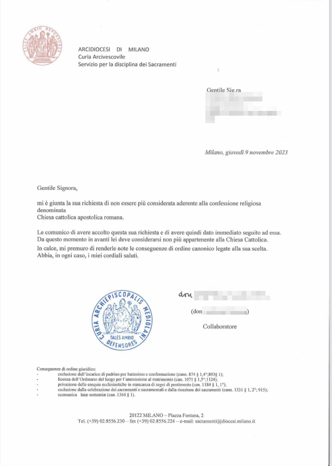 Una persona ha chiesto la rettifica dei dati relativi al proprio battesimo avvenuto a Maria Regina - PIOLTELLO (MI) il 09/11/2023, dichiarando di non voler più far parte della Chiesa Cattolica.