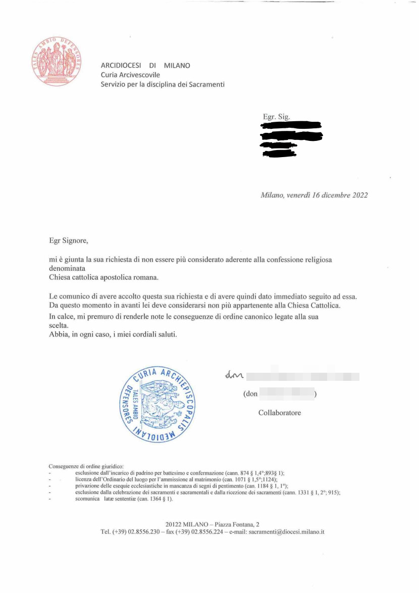 Una persona ha chiesto la rettifica dei dati relativi al proprio battesimo avvenuto a Dio Padre - SEGRATE (MI) il 16/12/2022, dichiarando di non voler più far parte della Chiesa Cattolica.