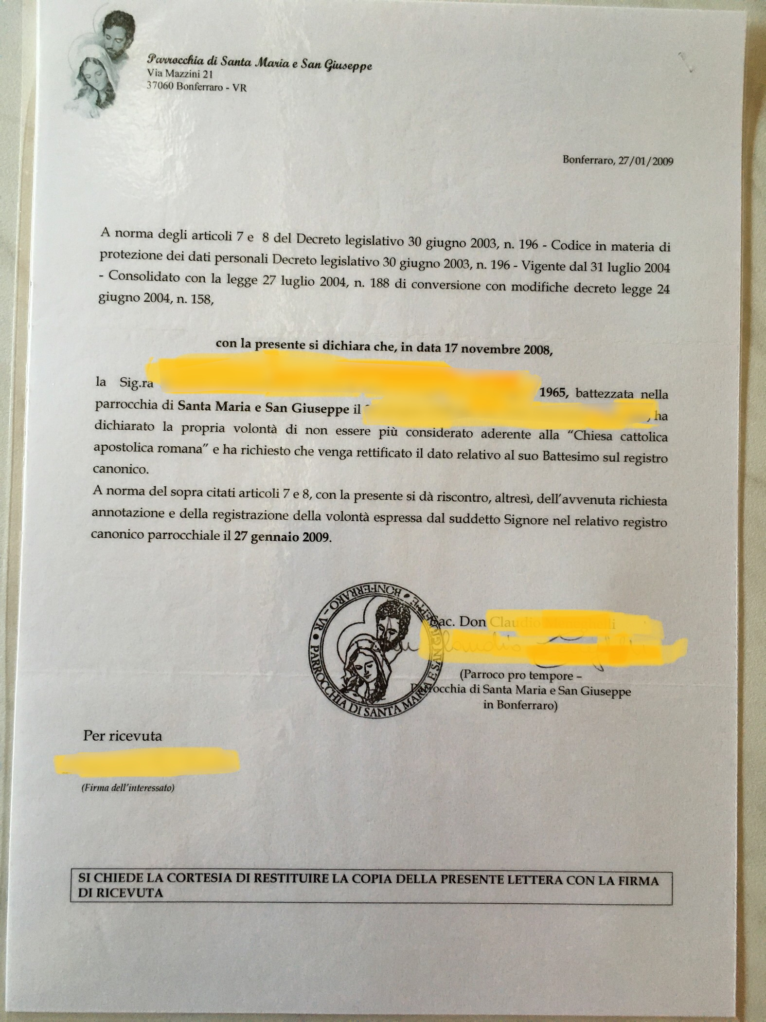 Una persona ha chiesto la rettifica dei dati relativi al proprio battesimo avvenuto a S. Maria e S. Giuseppe - SORGÀ (VR) il 27/01/2009, dichiarando di non voler più far parte della Chiesa Cattolica.