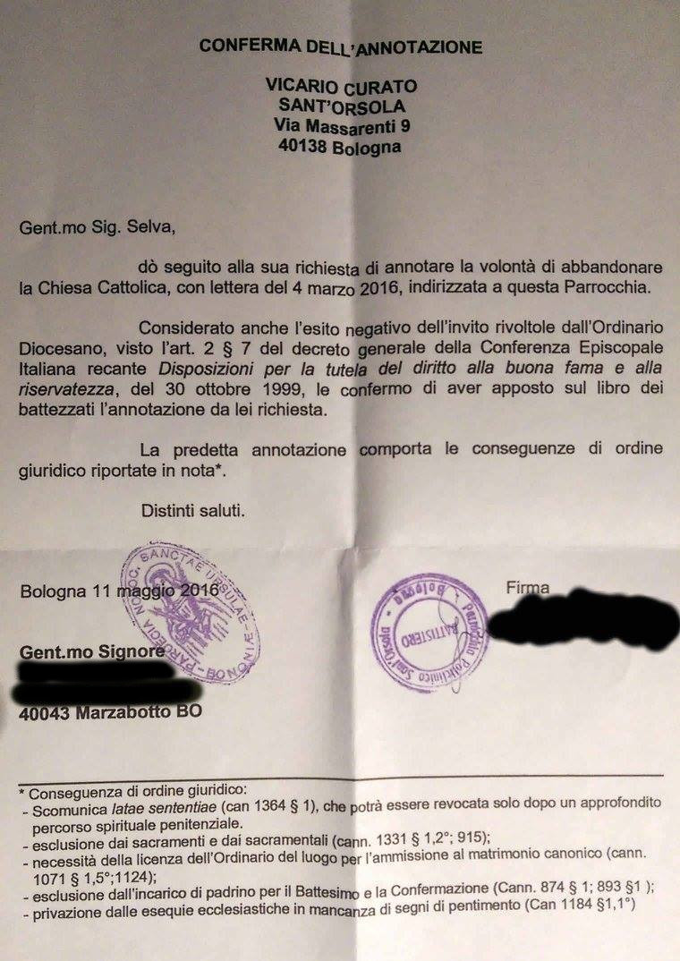 Una persona ha chiesto la rettifica dei dati relativi al proprio battesimo avvenuto a Sant'Orsola nel Policlinico - BOLOGNA (BO) il 11/05/2016, dichiarando di non voler più far parte della Chiesa Cattolica.