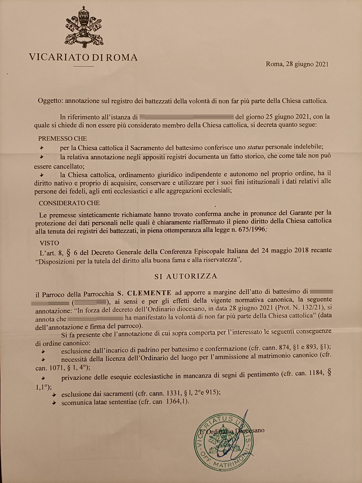 Una persona ha chiesto la rettifica dei dati relativi al proprio battesimo avvenuto a S. Clemente - ROMA (RM) il 28/06/2021, dichiarando di non voler più far parte della Chiesa Cattolica.
