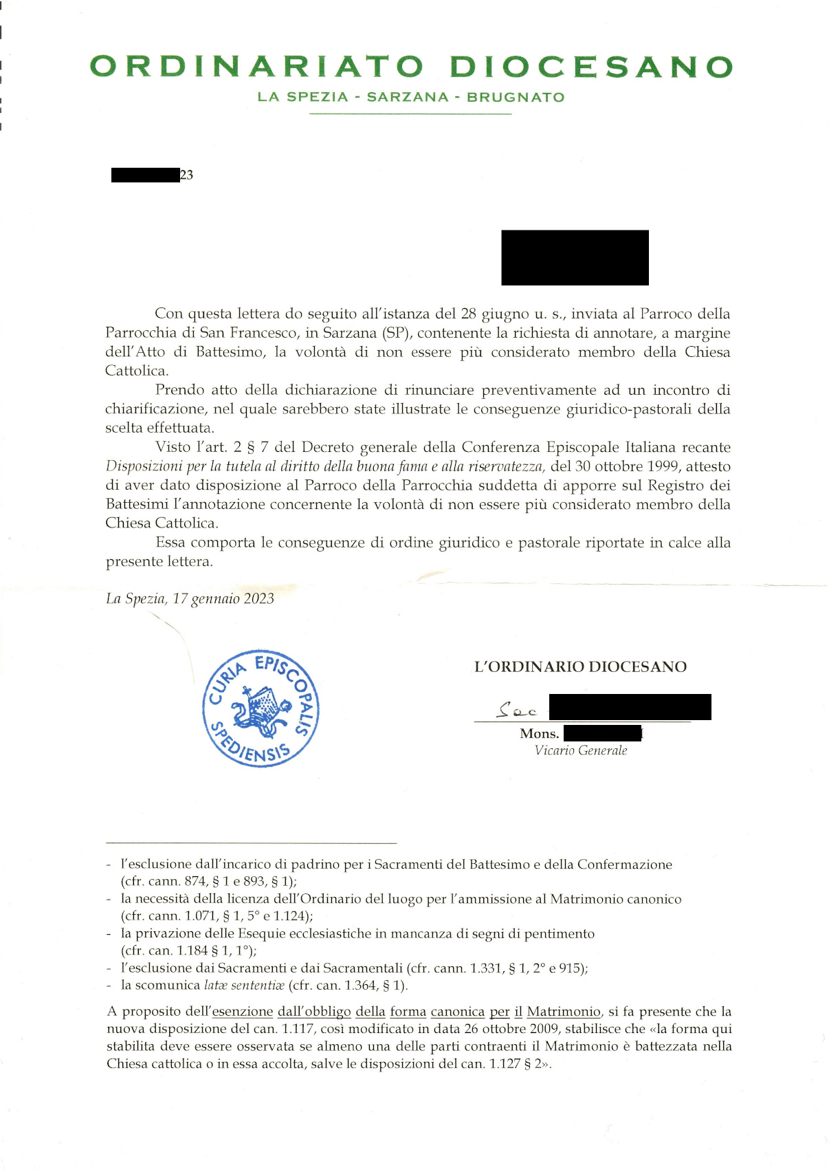 Una persona ha chiesto la rettifica dei dati relativi al proprio battesimo avvenuto a S. Francesco d'Assisi - SARZANA (SP) il 17/01/2023, dichiarando di non voler più far parte della Chiesa Cattolica.