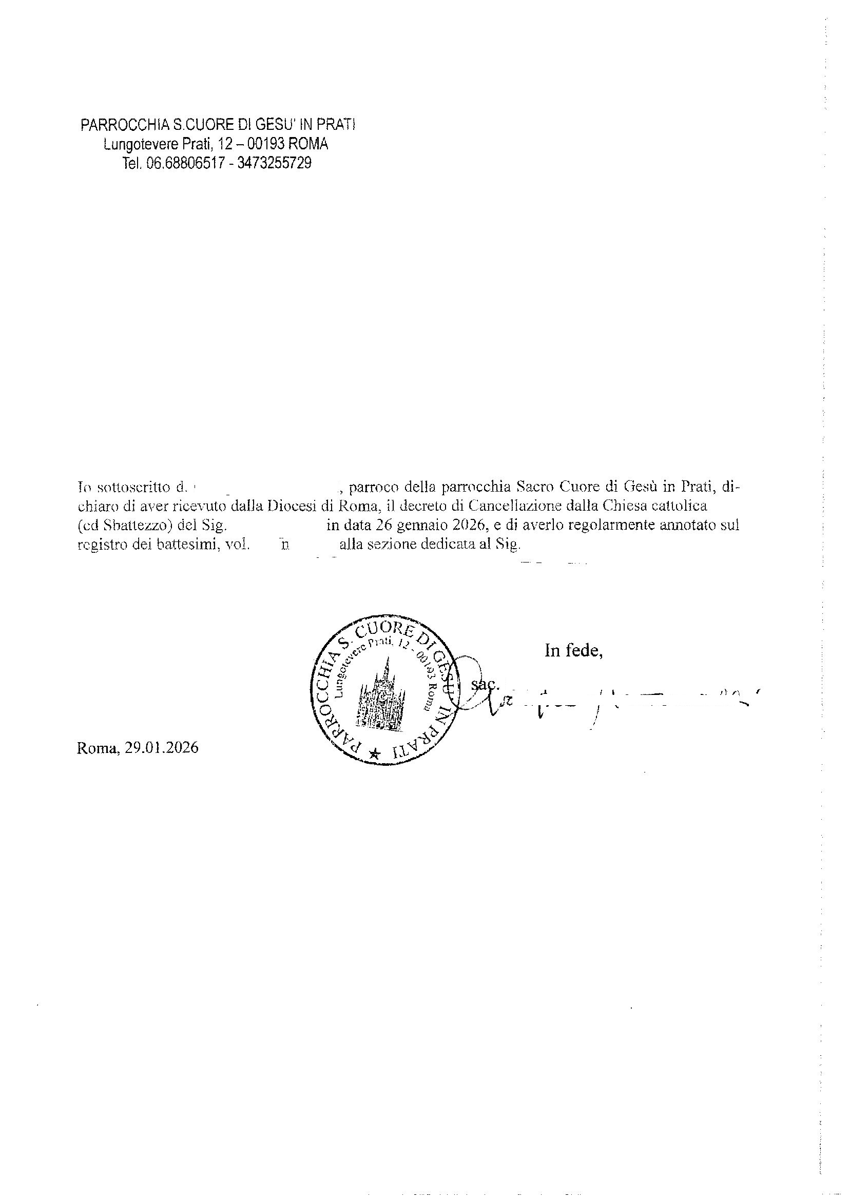 Una persona ha chiesto la rettifica dei dati relativi al proprio battesimo avvenuto a Sacro Cuore di Gesù in Prati - ROMA (RM) il 29/01/2026, dichiarando di non voler più far parte della Chiesa Cattolica.