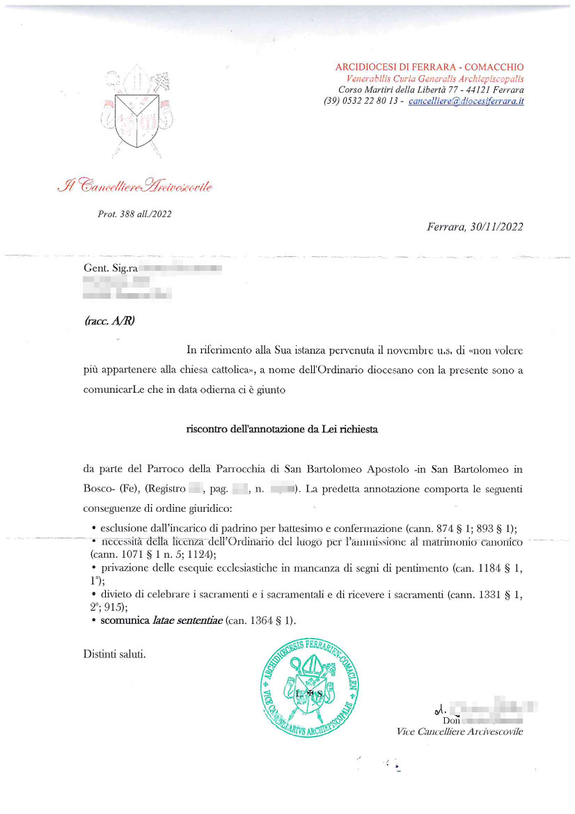 Una persona ha chiesto la rettifica dei dati relativi al proprio battesimo avvenuto a S. Bartolomeo Apostolo - FERRARA (FE) il 30/11/2022, dichiarando di non voler più far parte della Chiesa Cattolica.