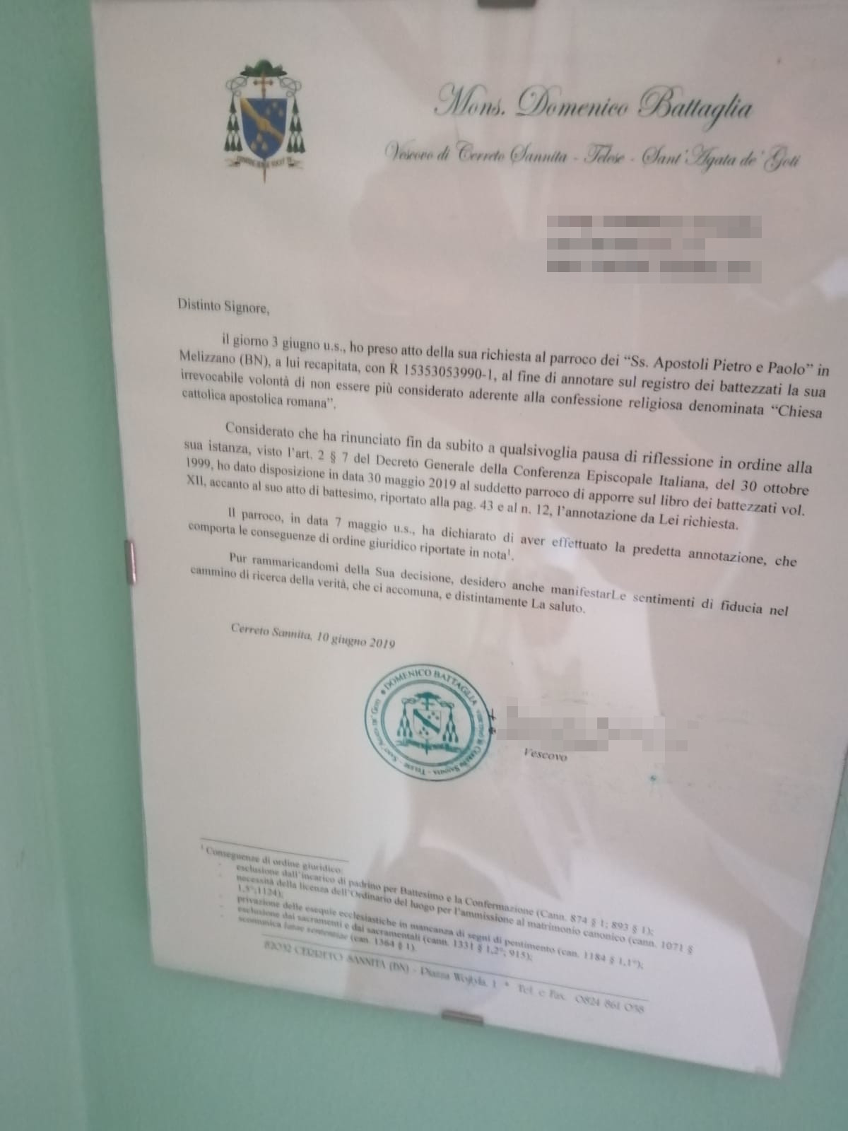 Una persona ha chiesto la rettifica dei dati relativi al proprio battesimo avvenuto a Santi Apostoli Pietro e Paolo - MELIZZANO (BN) il 10/06/2019, dichiarando di non voler più far parte della Chiesa Cattolica.