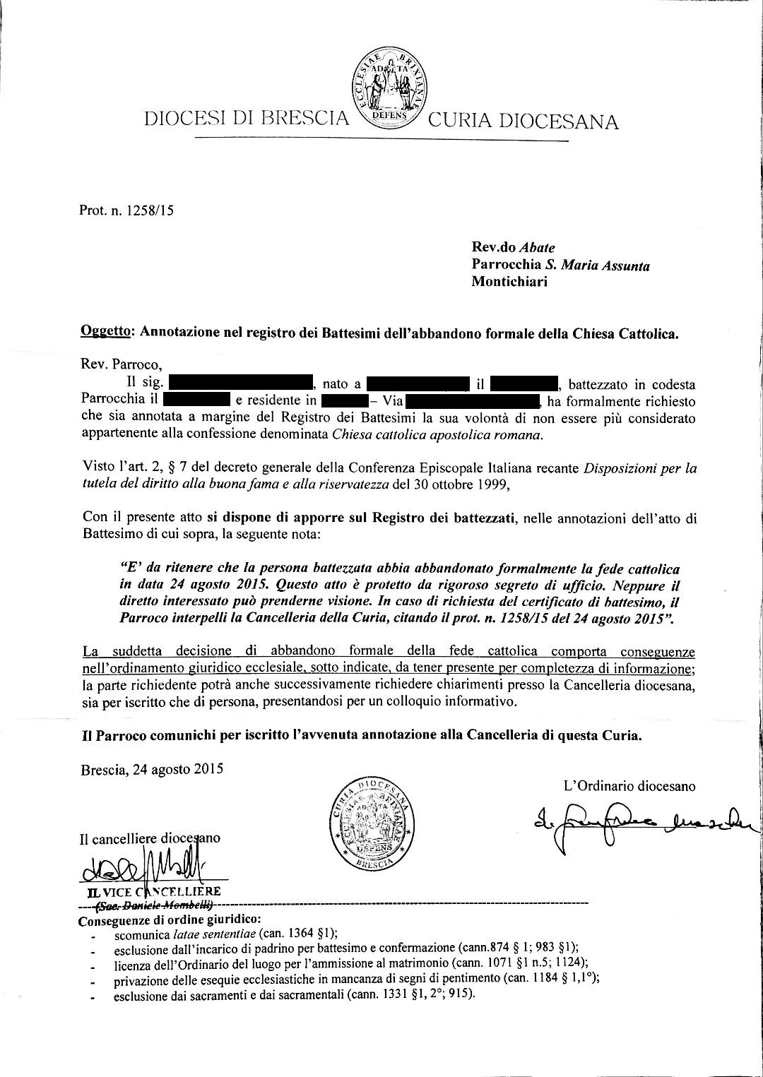 Una persona ha chiesto la rettifica dei dati relativi al proprio battesimo avvenuto a Santa Maria Assunta - MONTICHIARI (BS) il 24/08/2015, dichiarando di non voler più far parte della Chiesa Cattolica.