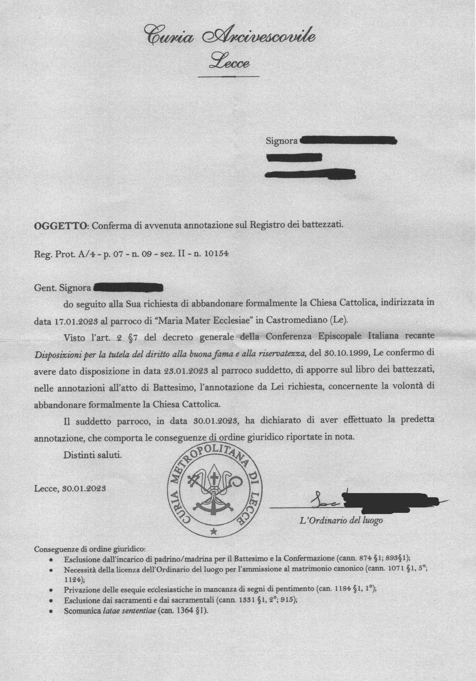 Una persona ha chiesto la rettifica dei dati relativi al proprio battesimo avvenuto a Mater Ecclesiae - CASTROMEDIANO (LE) il 30/01/2023, dichiarando di non voler più far parte della Chiesa Cattolica.