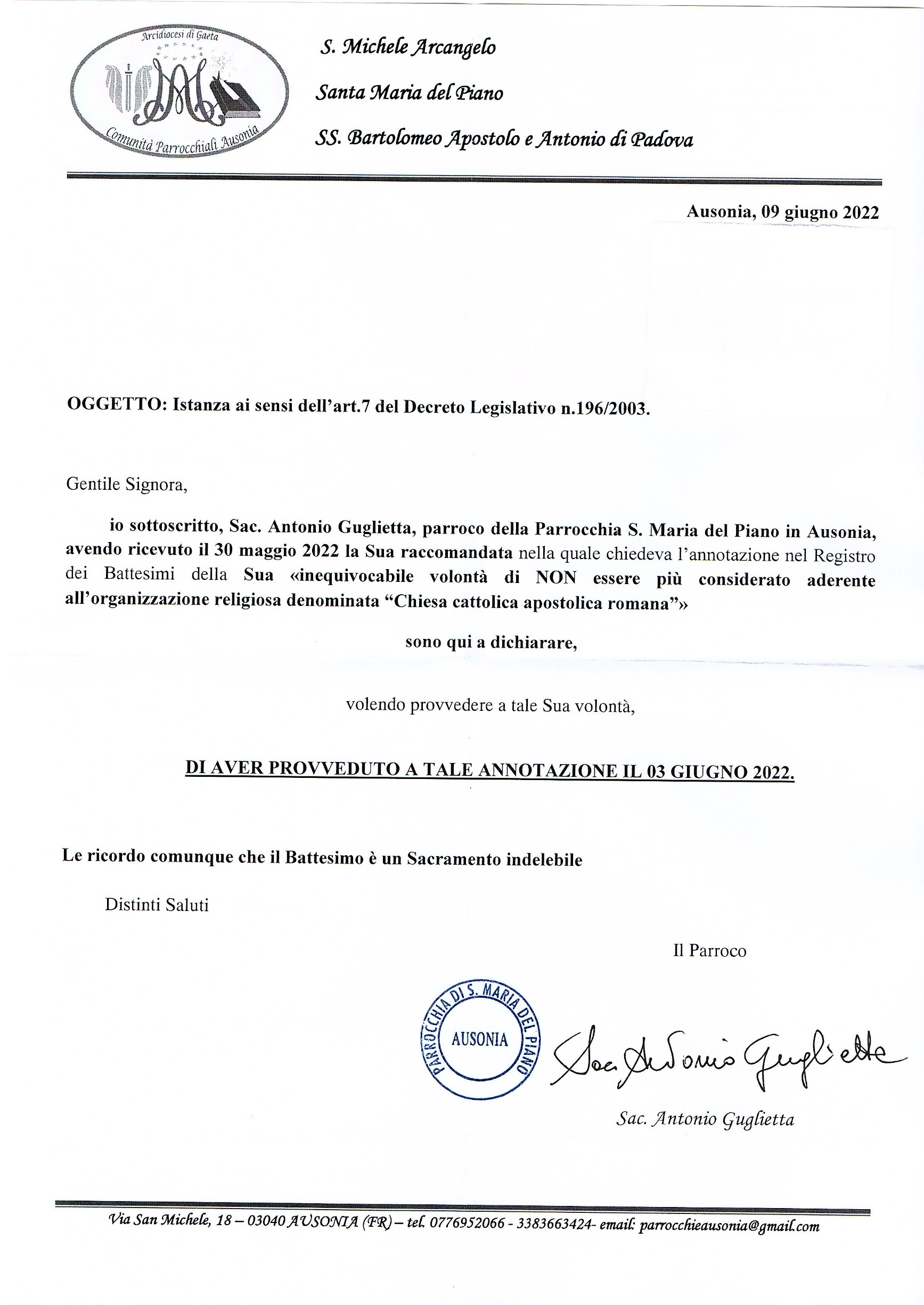 Una persona ha chiesto la rettifica dei dati relativi al proprio battesimo avvenuto a S. Maria del Piano - AUSONIA (FR) il 09/06/2022, dichiarando di non voler più far parte della Chiesa Cattolica.