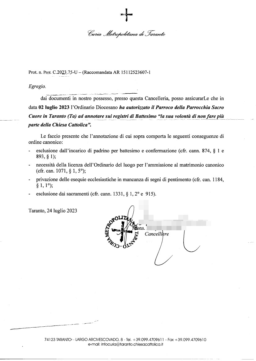 Una persona ha chiesto la rettifica dei dati relativi al proprio battesimo avvenuto a Sacro Cuore - TARANTO (TA) il 24/07/2023, dichiarando di non voler più far parte della Chiesa Cattolica.