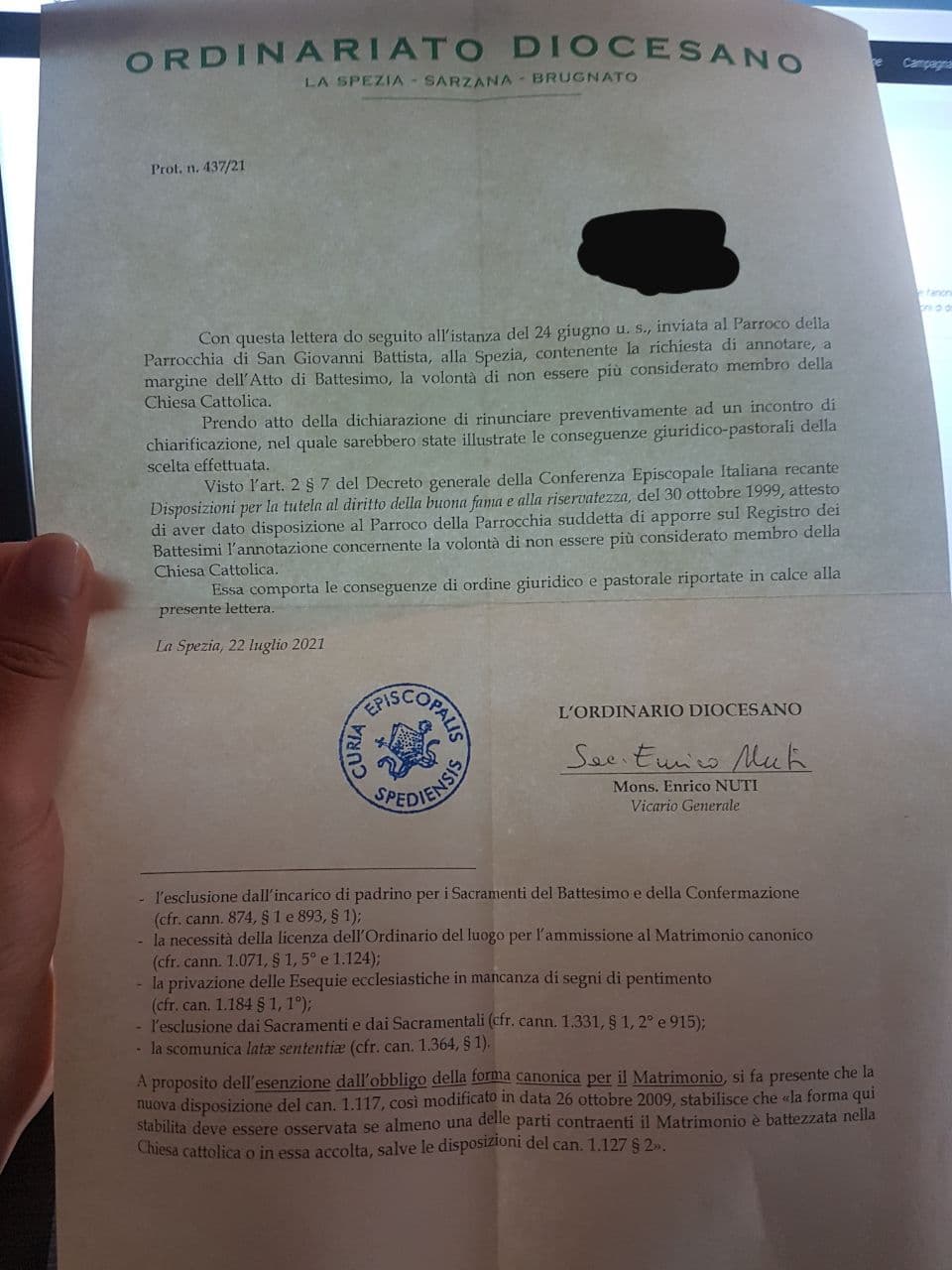 Una persona ha chiesto la rettifica dei dati relativi al proprio battesimo avvenuto a San Giovanni Battista - LA SPEZIA (SP) il 22/07/2021, dichiarando di non voler più far parte della Chiesa Cattolica.