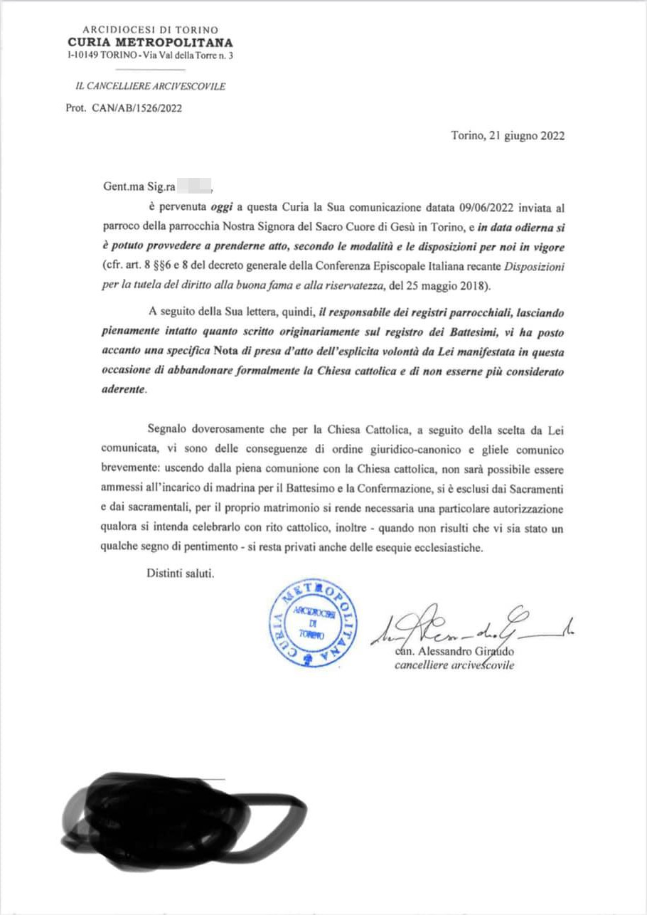 Una persona ha chiesto la rettifica dei dati relativi al proprio battesimo avvenuto a Nostra Signora del Sacro Cuore di Gesù - TORINO (TO) il 22/06/2022, dichiarando di non voler più far parte della Chiesa Cattolica.