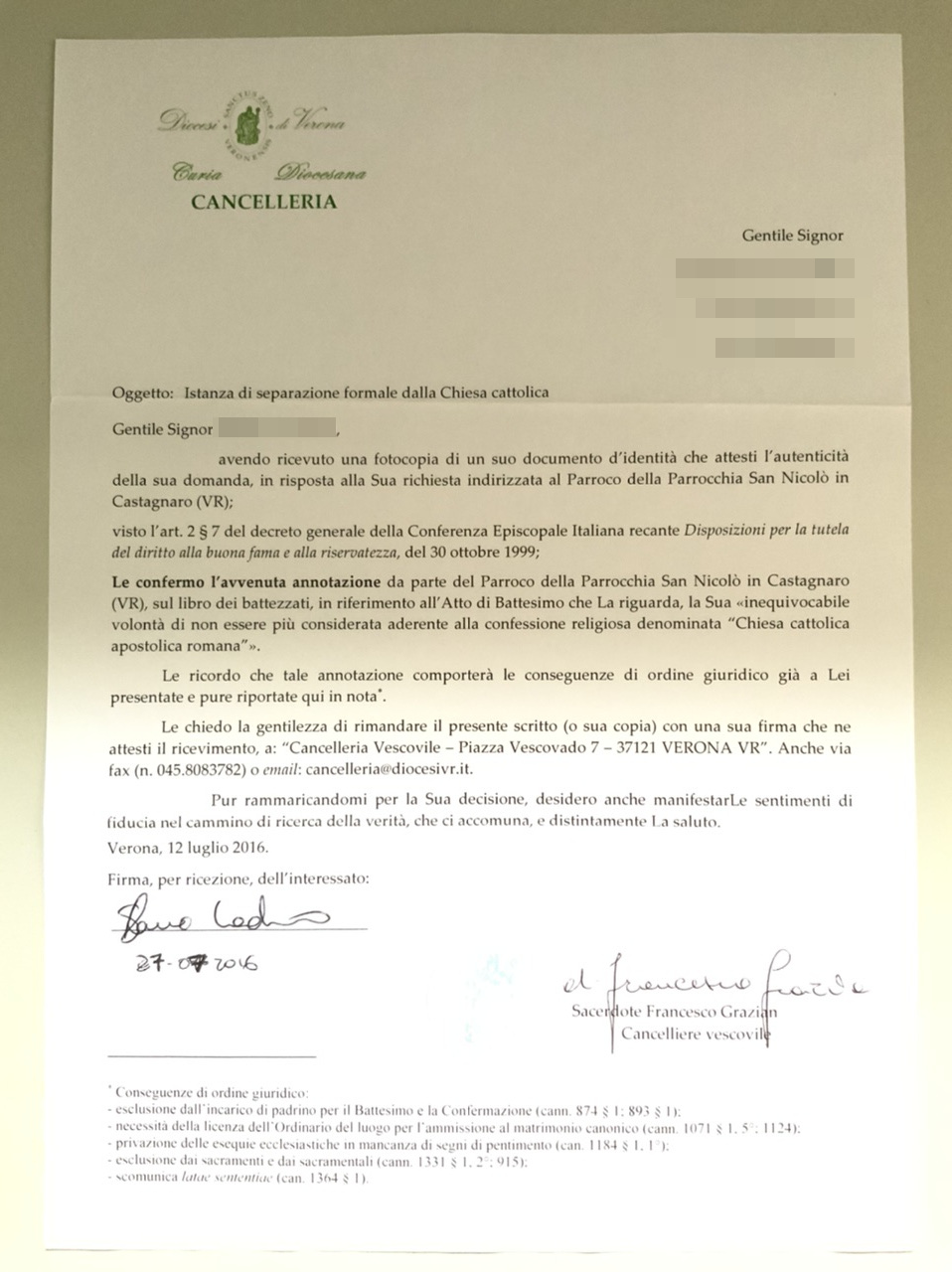 Una persona ha chiesto la rettifica dei dati relativi al proprio battesimo avvenuto a S. Nicolò - CASTAGNARO (VR) il 27/07/2016, dichiarando di non voler più far parte della Chiesa Cattolica.
