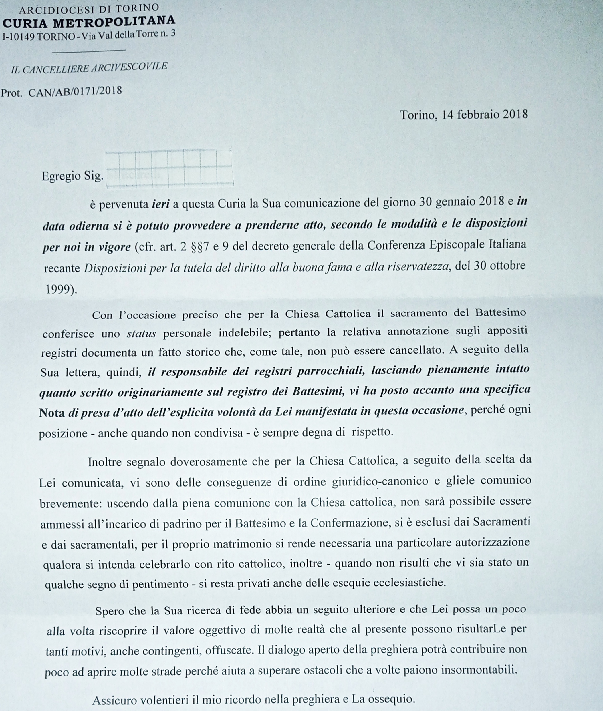 Una persona ha chiesto la rettifica dei dati relativi al proprio battesimo avvenuto a S. Bernardino Da Siena - TORINO (TO) il 14/02/2018, dichiarando di non voler più far parte della Chiesa Cattolica.