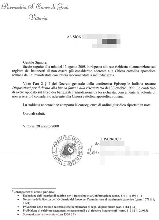 Una persona ha chiesto la rettifica dei dati relativi al proprio battesimo avvenuto a Sacro Cuore di Gesù - VITTORIA (RG) il 28/08/2008, dichiarando di non voler più far parte della Chiesa Cattolica.