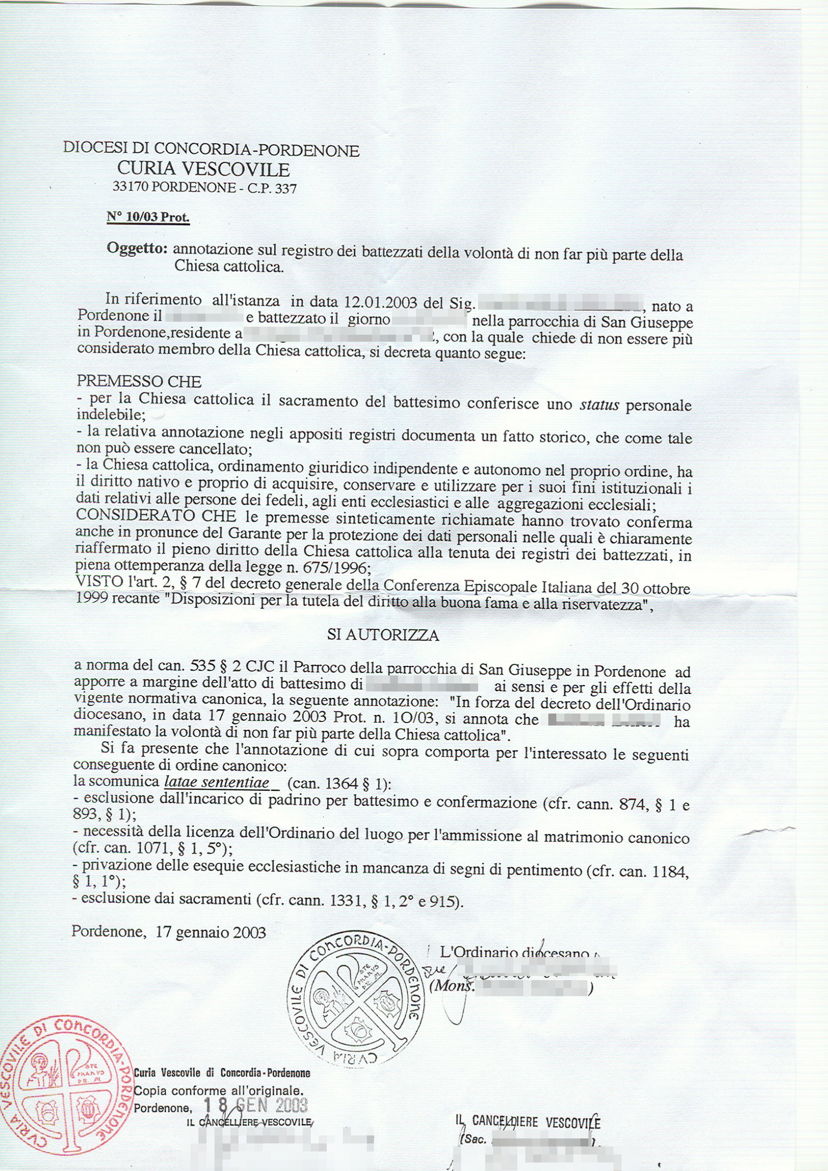 Una persona ha chiesto la rettifica dei dati relativi al proprio battesimo avvenuto a S. Giuseppe - PORDENONE (PN) il 17/01/2003, dichiarando di non voler più far parte della Chiesa Cattolica.