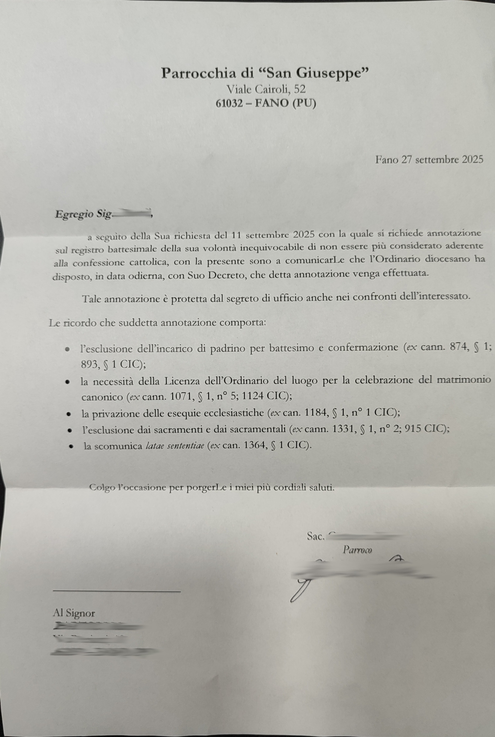 Una persona ha chiesto la rettifica dei dati relativi al proprio battesimo avvenuto a S. Marco Evangelista - FANO (PU) il 27/09/2025, dichiarando di non voler più far parte della Chiesa Cattolica.