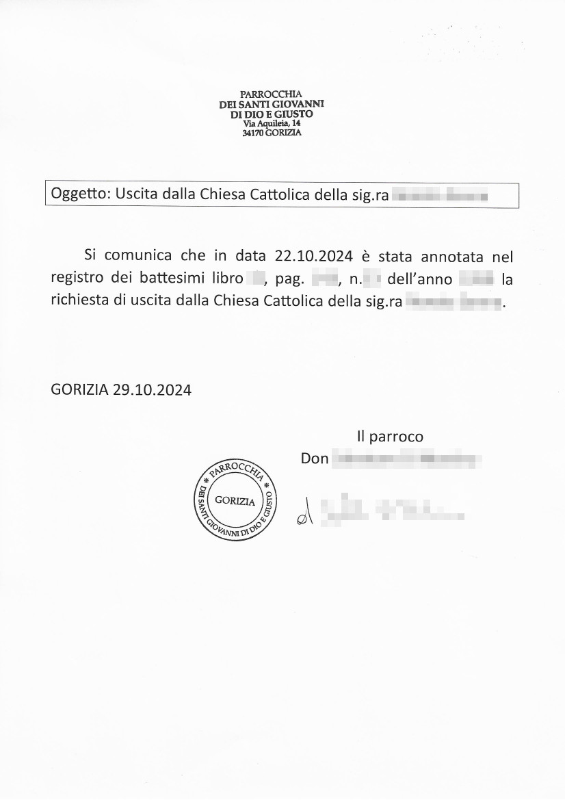 Una persona ha chiesto la rettifica dei dati relativi al proprio battesimo avvenuto a Santi Giovanni di Dio e Giusto - GORIZIA (GO) il 29/10/2024, dichiarando di non voler più far parte della Chiesa Cattolica.