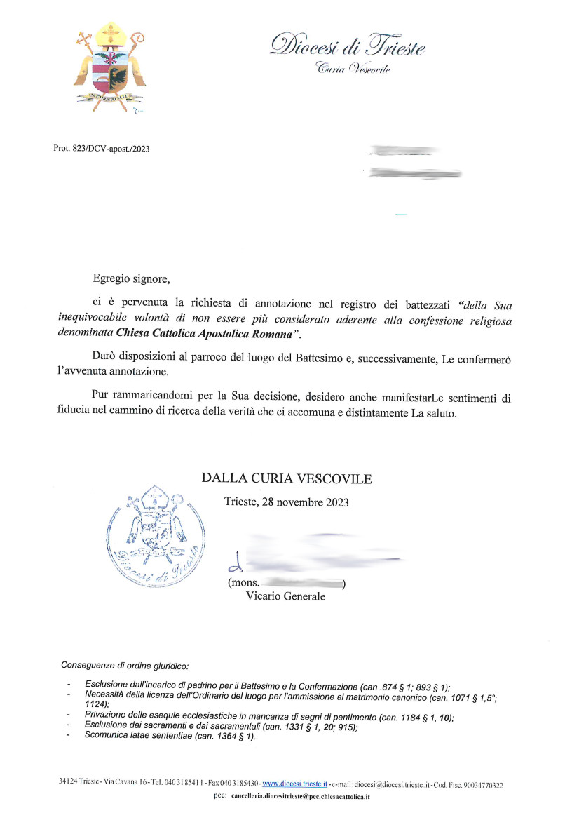 Una persona ha chiesto la rettifica dei dati relativi al proprio battesimo avvenuto a Ospedale Maggiore - TRIESTE (TS) il 28/11/2023, dichiarando di non voler più far parte della Chiesa Cattolica.