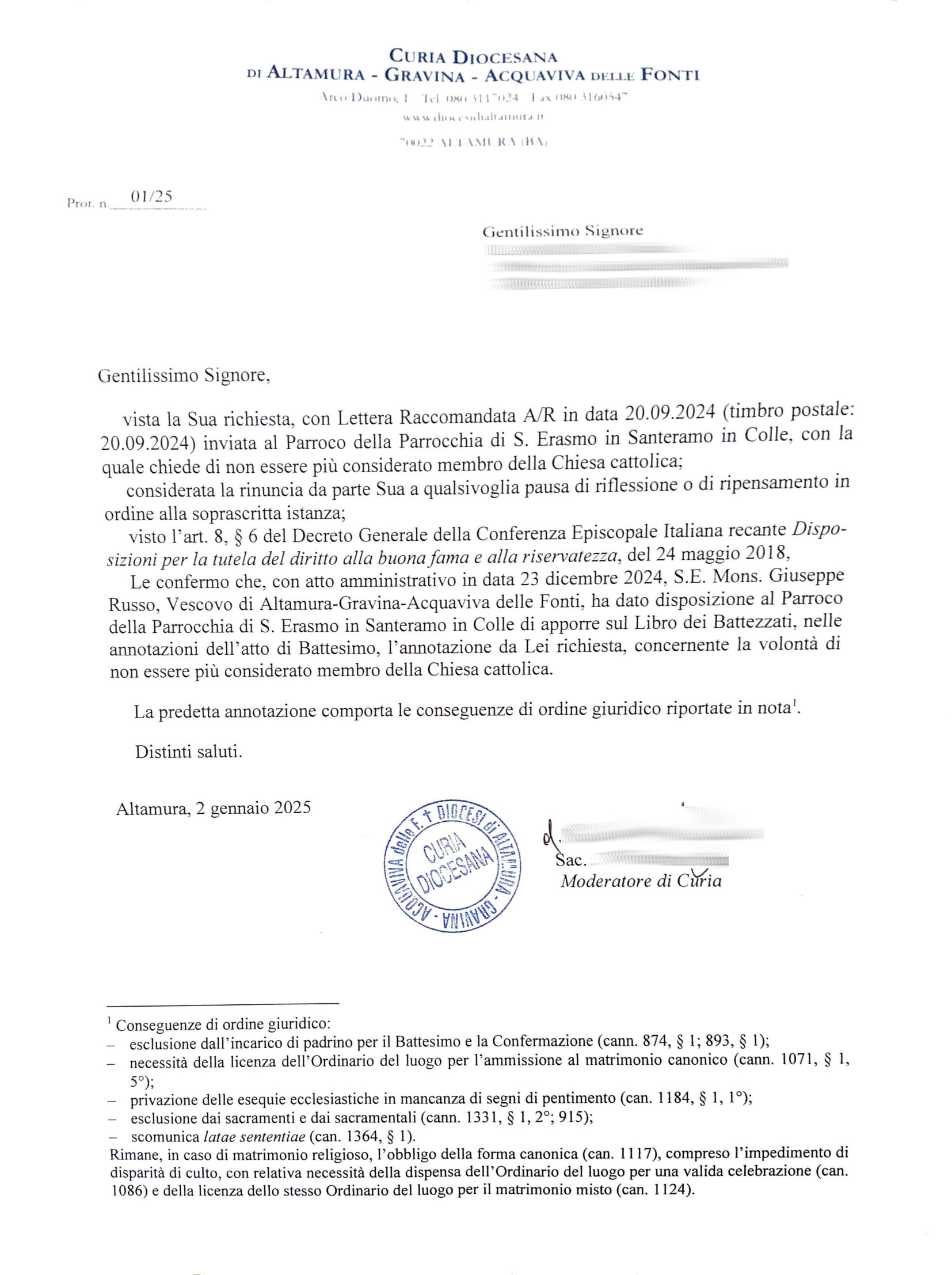 Una persona ha chiesto la rettifica dei dati relativi al proprio battesimo avvenuto a S. Erasmo - SANTERAMO IN COLLE (BA) il 10/01/2025, dichiarando di non voler più far parte della Chiesa Cattolica.