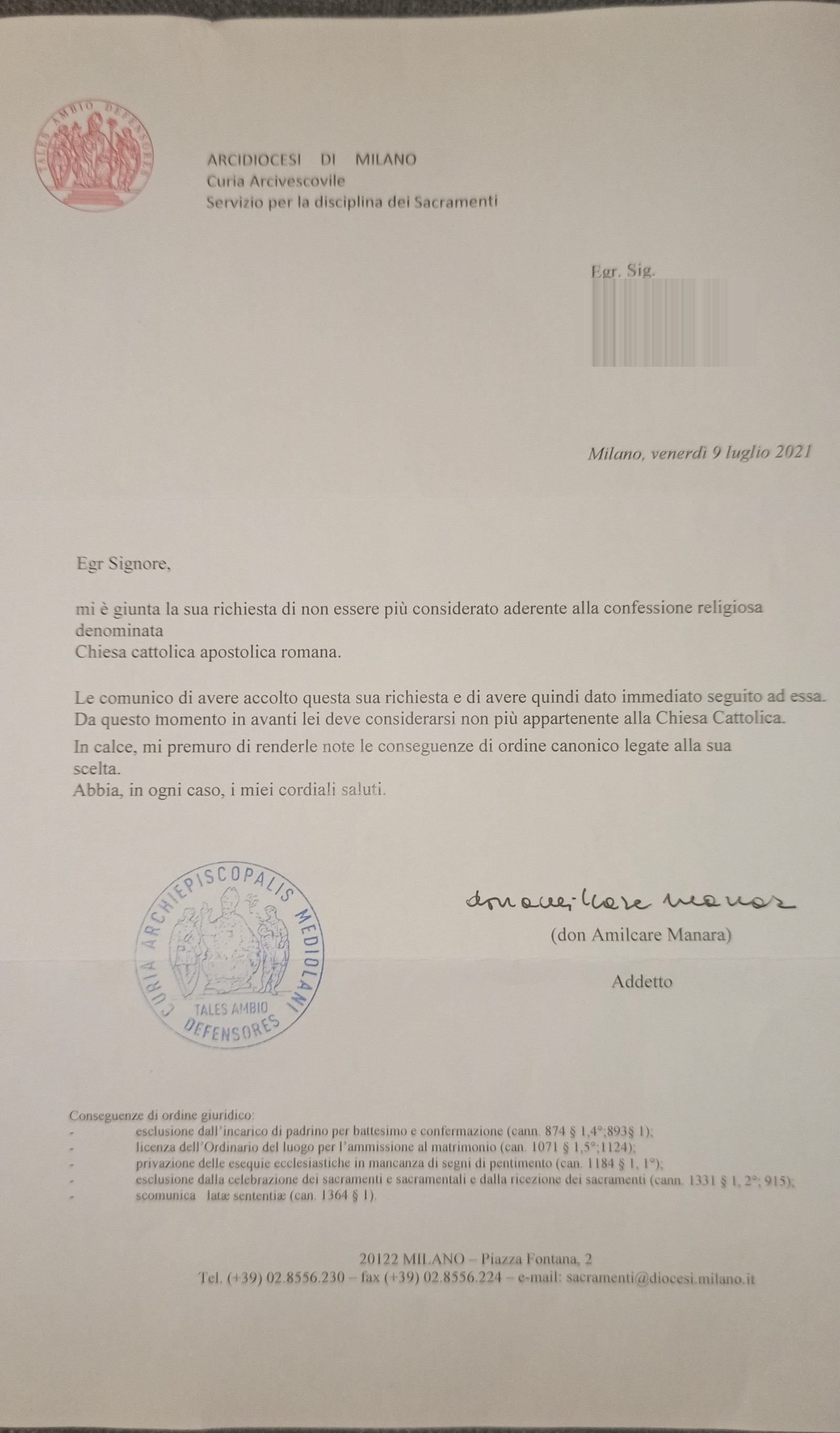 Una persona ha chiesto la rettifica dei dati relativi al proprio battesimo avvenuto a S. Carlo Borromeo - VARESE (VA) il 09/07/2021, dichiarando di non voler più far parte della Chiesa Cattolica.
