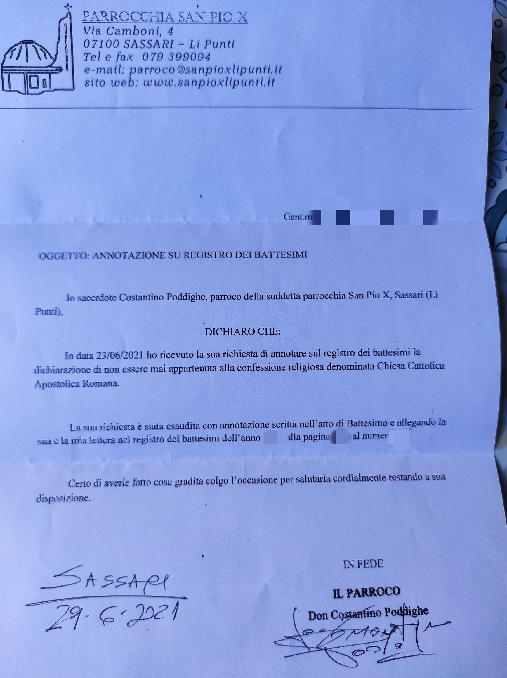 Una persona ha chiesto la rettifica dei dati relativi al proprio battesimo avvenuto a S. Pio X - SASSARI (SS) il 26/06/2021, dichiarando di non voler più far parte della Chiesa Cattolica.