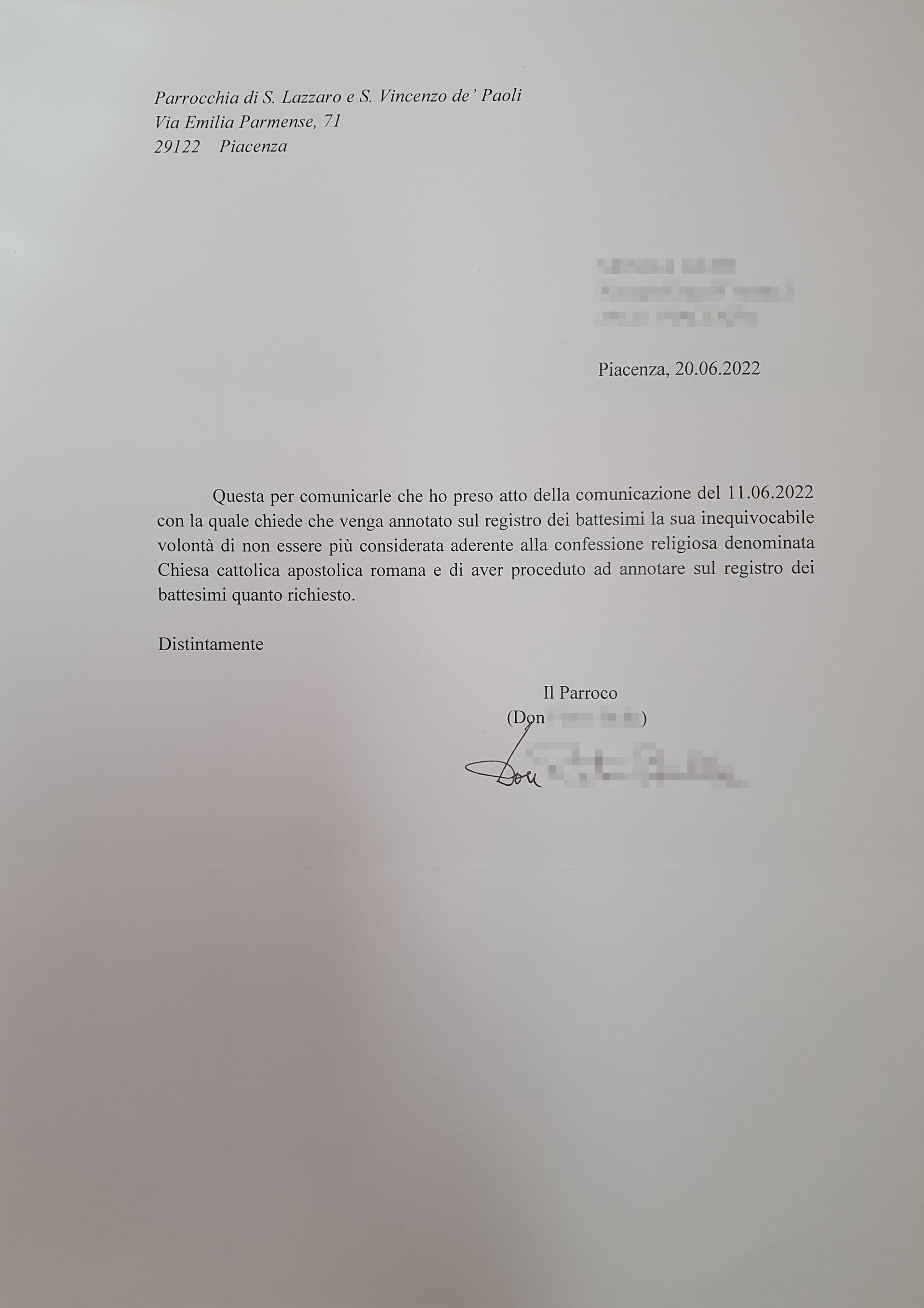Una persona ha chiesto la rettifica dei dati relativi al proprio battesimo avvenuto a S. Lazzaro e S. Vincenzo De Paoli - PIACENZA (PC) il 20/06/2022, dichiarando di non voler più far parte della Chiesa Cattolica.