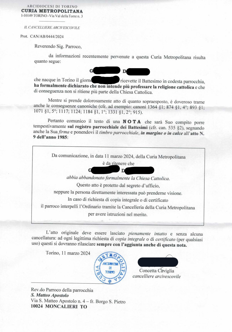 Una persona ha chiesto la rettifica dei dati relativi al proprio battesimo avvenuto a S. Matteo Apostolo - MONCALIERI (TO) il 11/03/2024, dichiarando di non voler più far parte della Chiesa Cattolica.