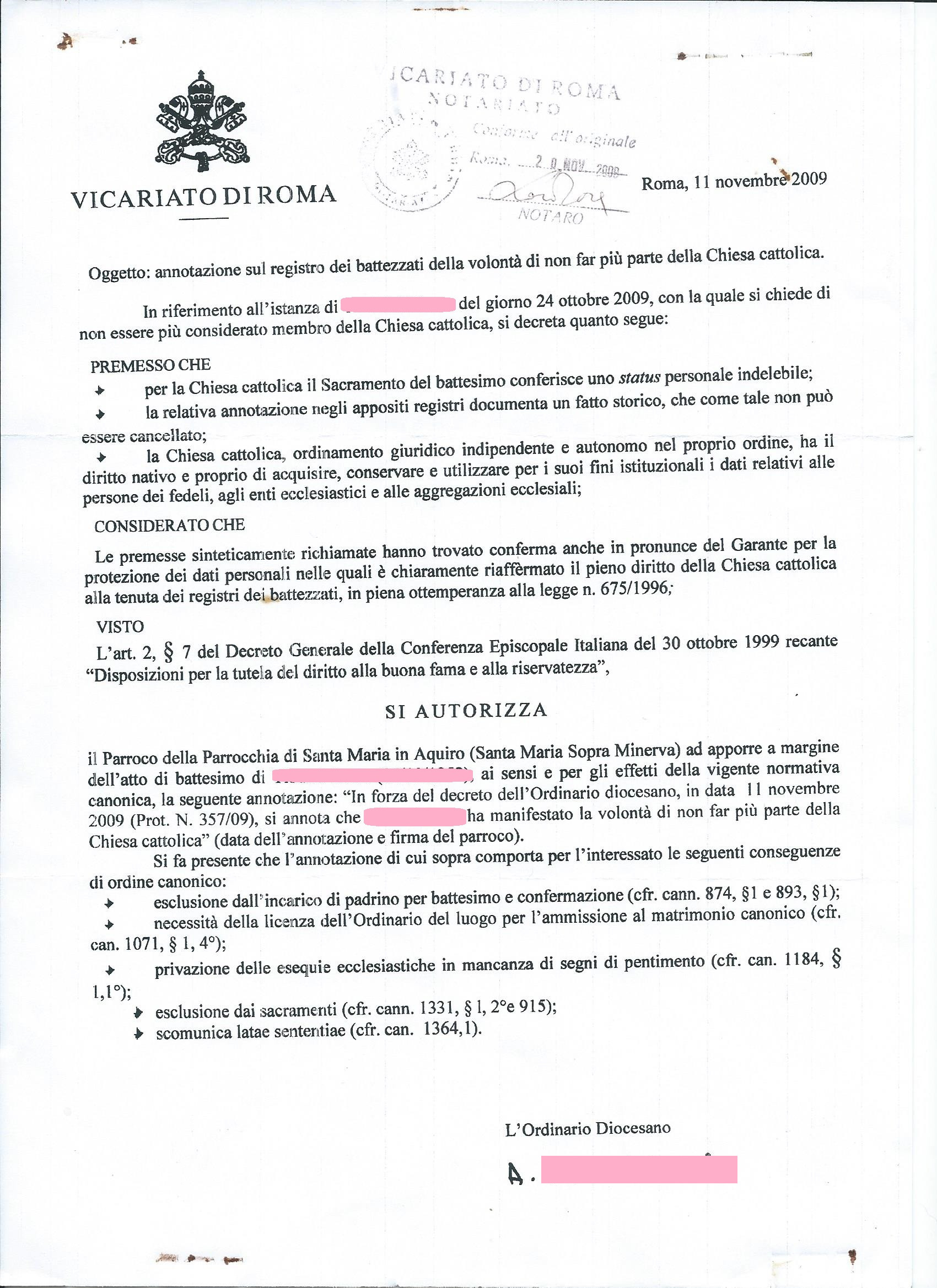 Da molti anni ho incorniciato ed appeso nella mia "stanza/studio" la risposta del Vicariato di Roma. L'ho voluto fare per ricordarmi ogni giorno da dove sono dovuta partire per liberarmi delle religioni...TUTTE!